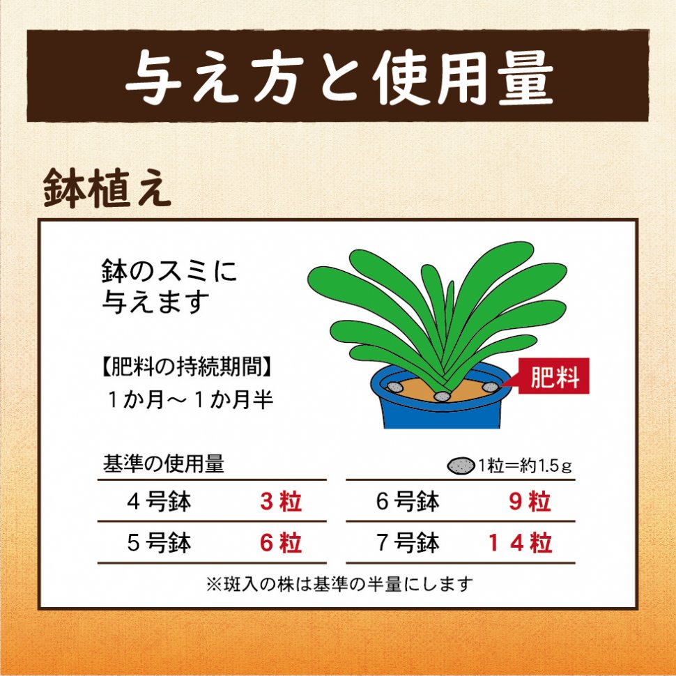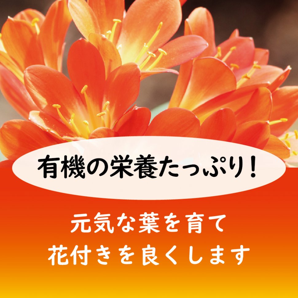 【特長】 ●有機の栄養たっぷり!元気な葉を育て花付きを良くします。 ●葉色ツヤツヤに。アミノ酸とミネラル配合です。 ●簡単!おくだけ。植物に与えやすいブリケット形状です。 【成分】 チッソ:4% リン酸:6% カリ:2%