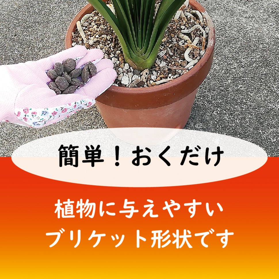 室内で使える!低臭&カビにくい! 有機の栄養たっぷり!元気な葉を育て花付きを良くします。 葉色ツヤツヤに。アミノ酸とミネラル配合です。 簡単!おくだけ。植物に与えやすいブリケット形状です。