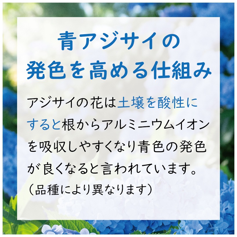 アジサイの花は土壌を酸性にすると根からアルミニウムイオンを吸収しやすくなり青色の発色が良くなると言われています。(品種により異なります)