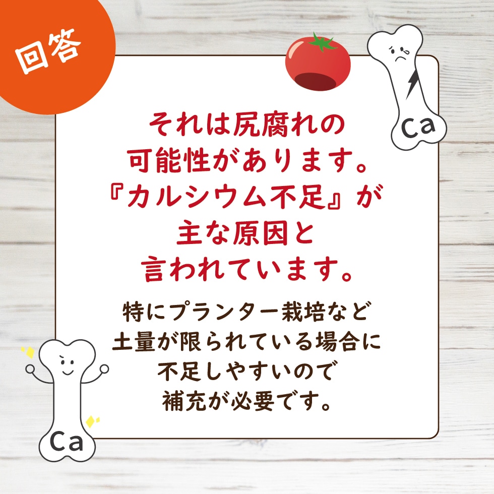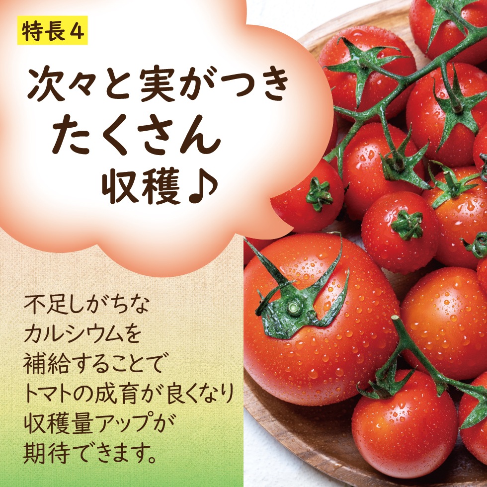 不足しがちなカルシウムを補給することで、トマトの成育が良くなり収穫量アップが期待できます。