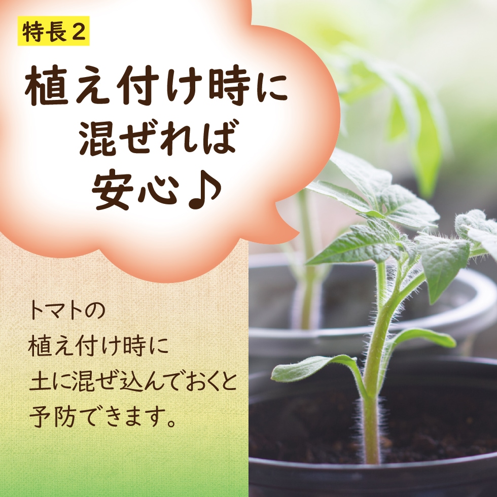 ●トマトの植え付け時に土に混ぜ込んでおくと予防できます。