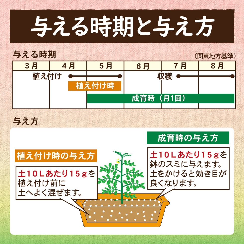 トマトの植え付け時に土に混ぜ込んでおくと予防できます。